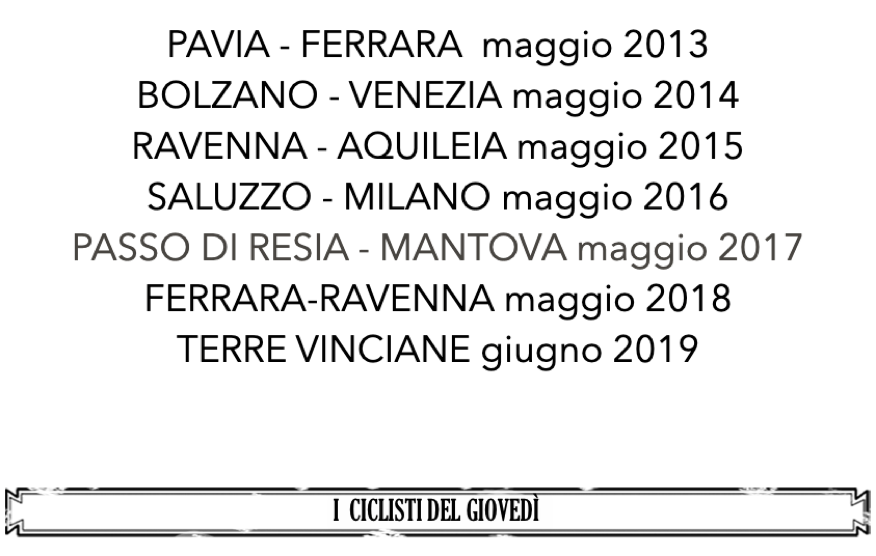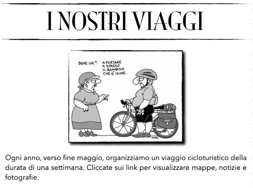 Ogni anno, verso fine maggio, organizziamo un viaggio cicloturistico nonché enogastronomico della durata di una settimana. Cliccate sui link per un breve resoconto e relative fotografie.